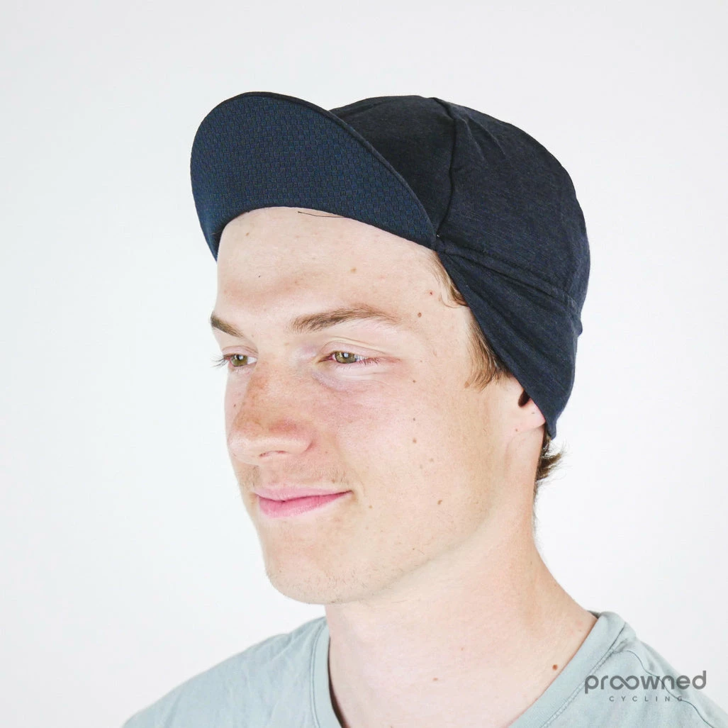 A technical winter cycling cap made with a blend of merino wool and polyester and a reinforced visor. The merino wool provides insulation and moisture control while maintaining great comfort. Extra warmth is added to the forehead and earflaps by a double layer of fabrics. The rest of the cap is made thin to fit perfectly under the helmet.