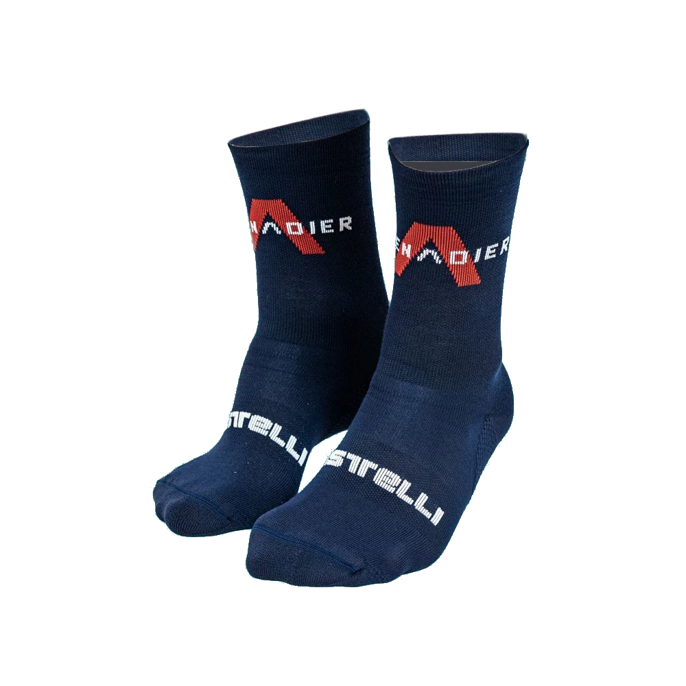 The sumptuous merino wool blend is used in the Castelli Quindici Soft Merino Socks by Ineos Grenadiers. The sock has a 15cm cuff, an arch support band, and a nylon heel and toe.