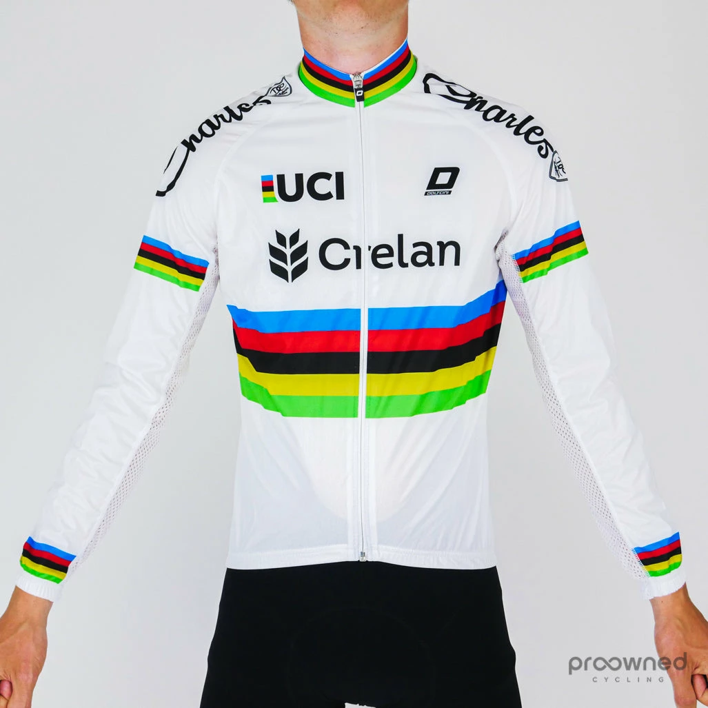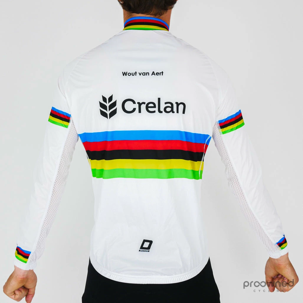 The jacket is specially made for World Champion Wout Van Aert and is styled with the original World Champion stripes. Wout Van Aert is written on the back. Made for the 2016 season.