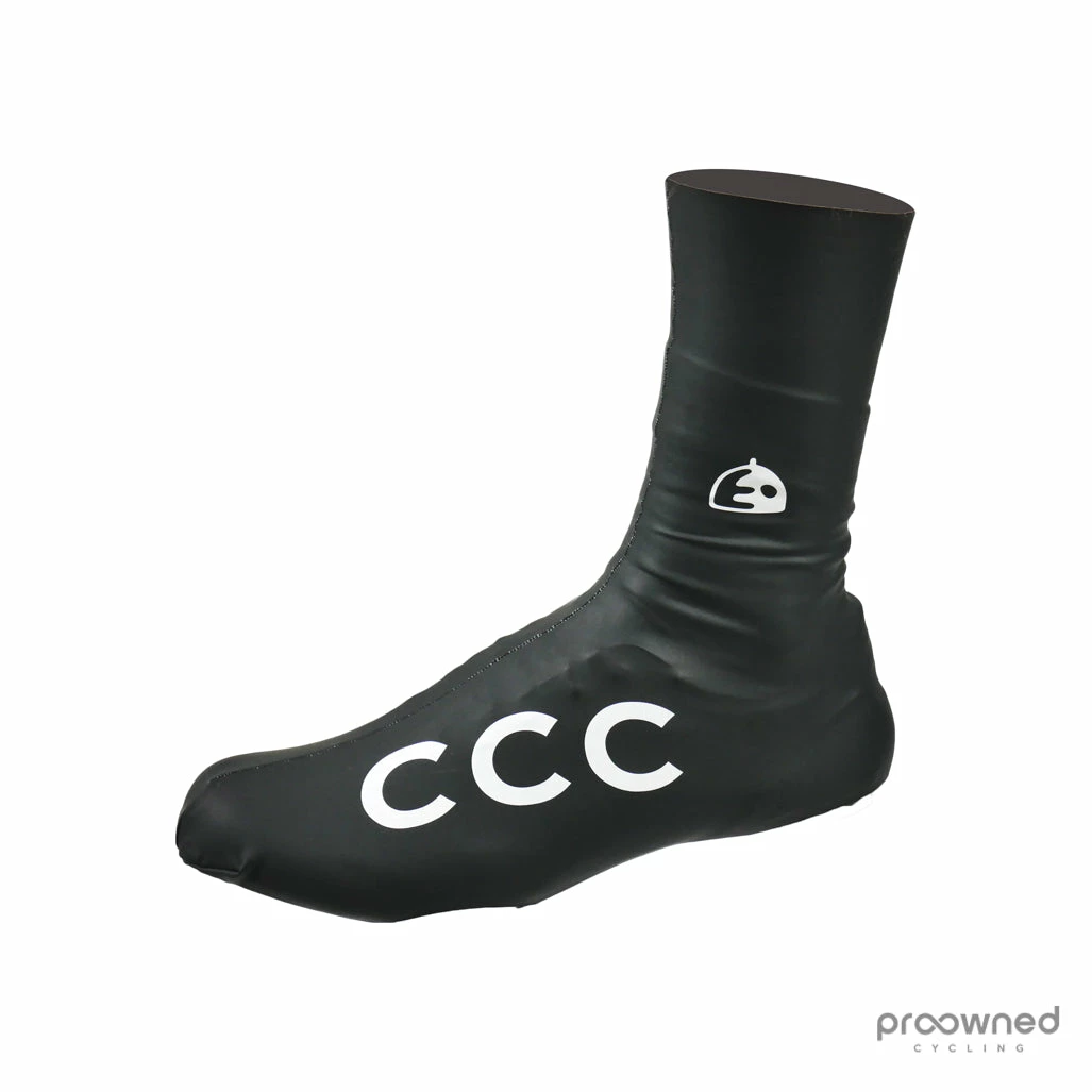 Brand new rain shoe covers from Team CCC* from the 2020 season. These race rain shoe covers are perfect for wet conditions because they are wind and waterproof with a high cuff. The shoe covers are made without zippers for a tight and waterproof design.