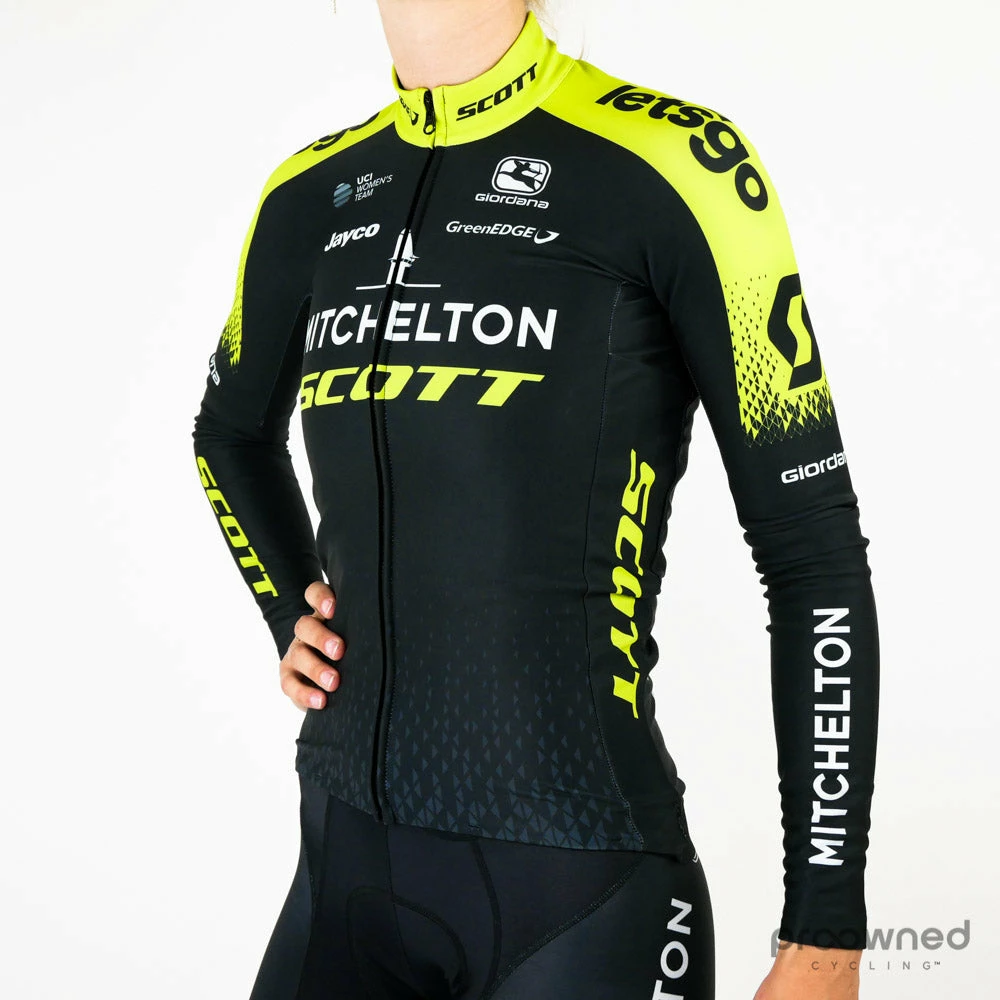 This long sleeve jersey from Giordana is the perfect companion on those spring and autumn rides where the roads are dry but the weather still chilly. The inside of the jersey is made of fleece material for both comfort and warmth. The jersey is specifically made for Team Mitchelton-Scott.