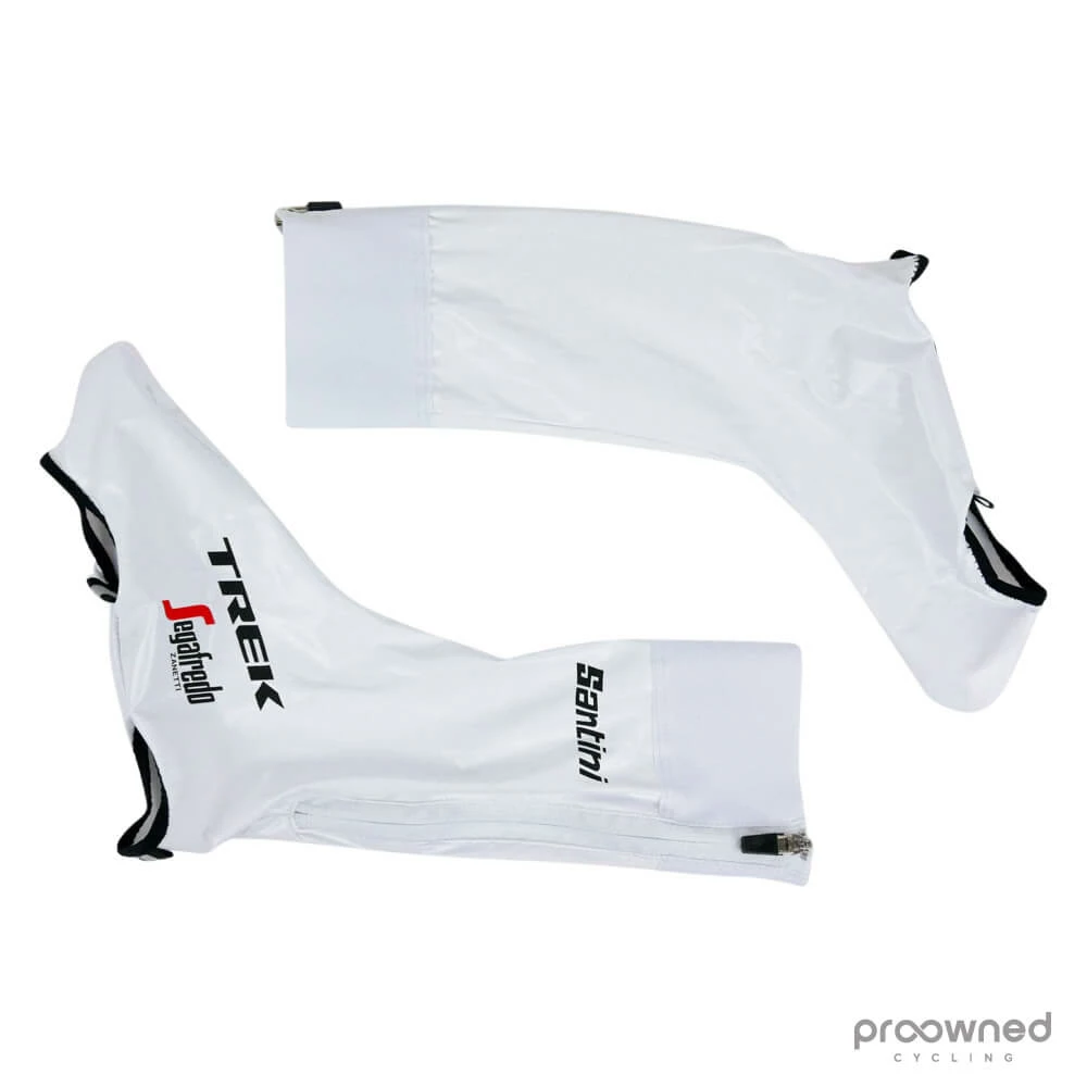 Brand new aero shoe cover from Santini. This aero shoe cover comes directly from the World Tour Trek-Segafredo Women team and is made for the 2019 season. The shoe covers come with a zipper on the back to make it easier to use while still be aerodynamic for time trials. The aero shoe covers are a thin shoe cover. These covers have a silicone band to keep them in place.